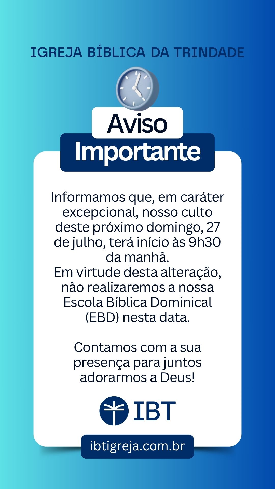 A paz do Senhor, querida igreja IBT!Gostaríamos de comunicar uma mudança especial para a nossa celebração deste fim de semana.Neste próximo domin...